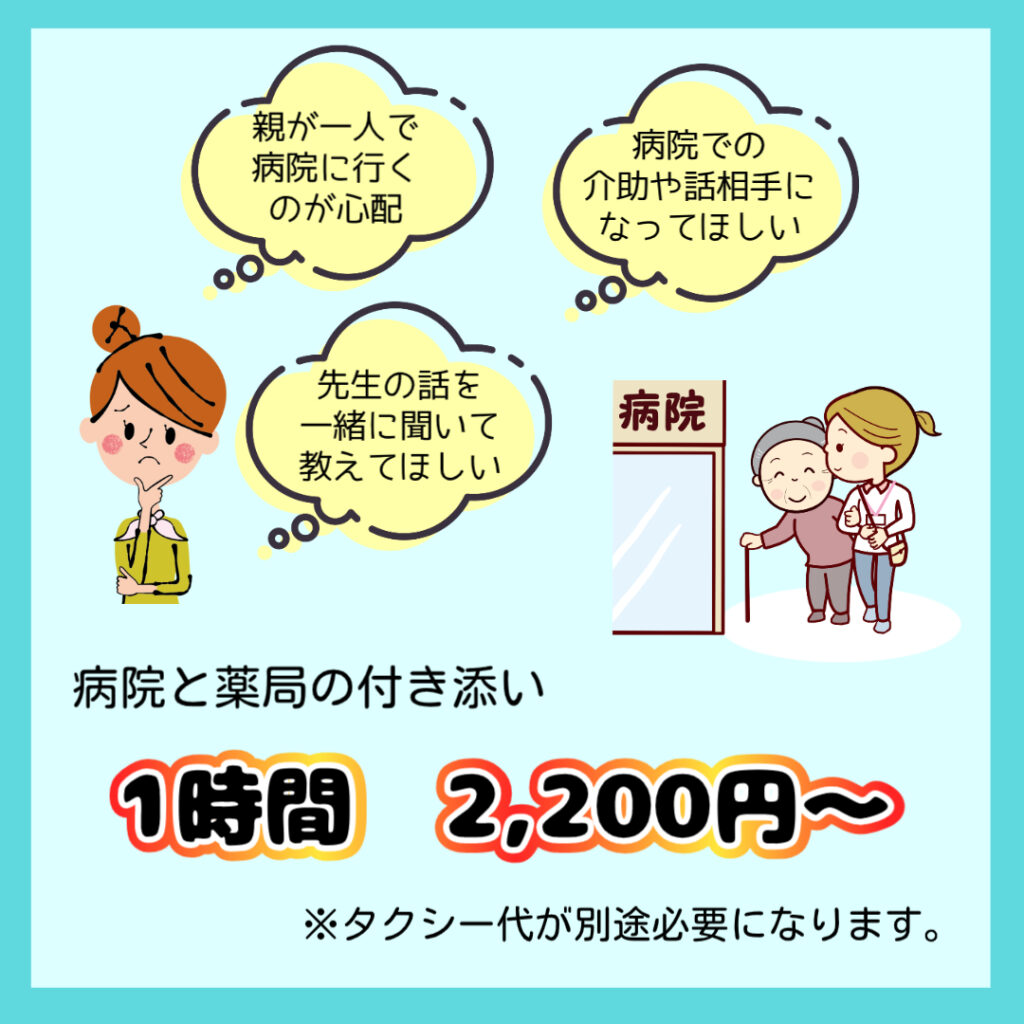 病院の付き添いは、1時間2,000円(税抜)です。
